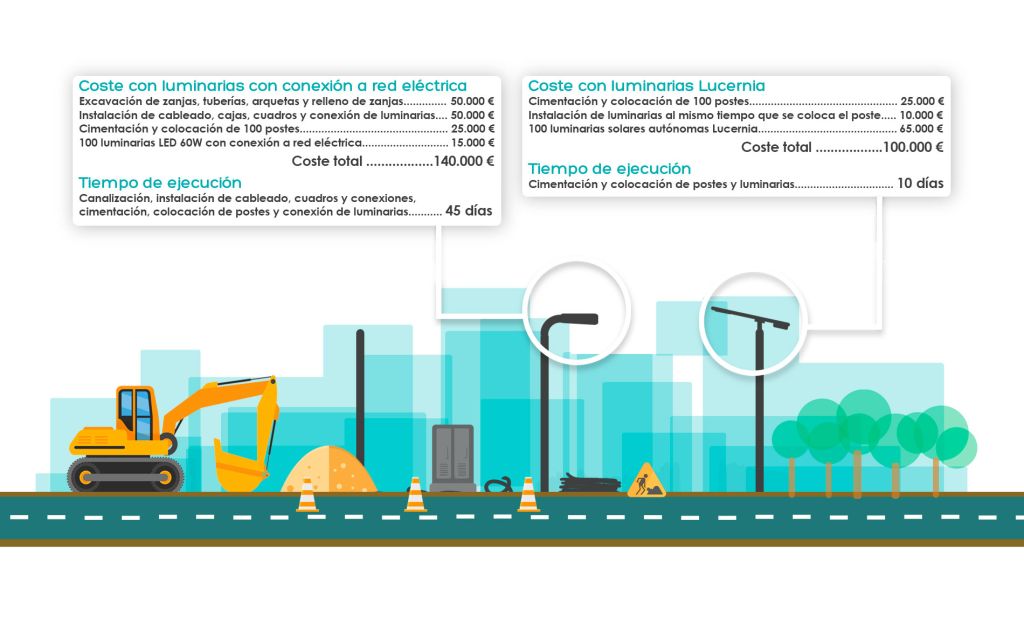 Con Lucernia el coste energético no existe, ya que la energía que consume es 100% solar, no necesitando red eléctrica para su funcionamiento, por lo que además aumentamos la seguridad y eliminamos riesgos.