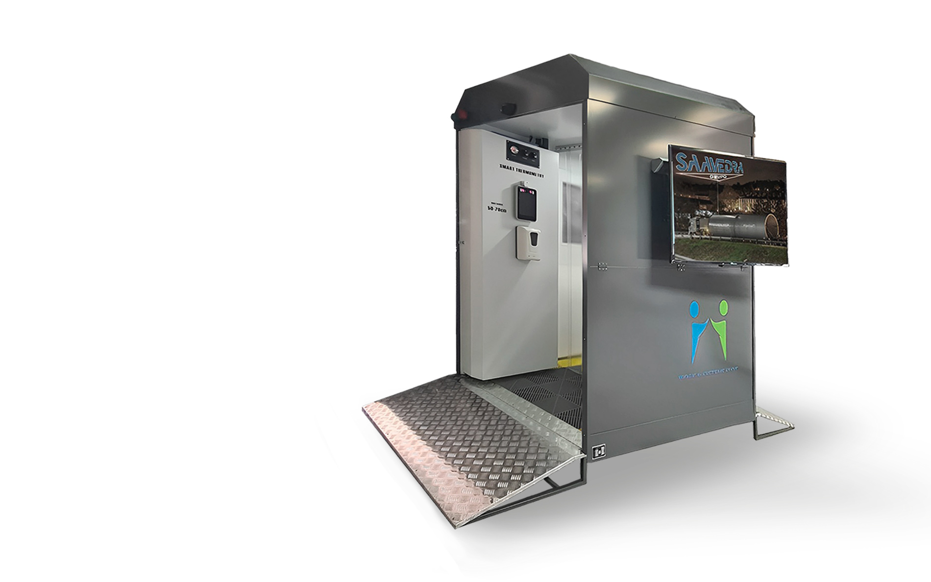 Cuenta con una pantalla de 8″ para medición de temperatura de alta precisión por infrarrojos, sensor de presencia y reconocimiento facial, detección de personas sin mascarilla y valor de temperatura fuera de rango con aviso e indicaciones de voz configurable en 18 idiomas y sistema de dosificación de gel desinfectante para manos.